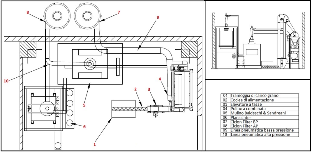 Nel nostro mulino artigianale, il processo di macinazione del grano avviene esclusivamente attraverso 3 fasi: la pulitura, la macinazione vera e propria e la setacciatura (o abburattamento). Per eseguire tali fasi, le cariossidi intere (germe e crusca inclusi) passano attraverso una serie di macchinari visibili in figura: